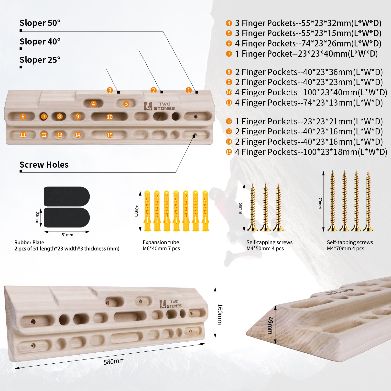- 💪[Multi-Functional Design]: The rock climbing hangboard is with slopes(3 different angles), 1/2/3/4 finger pockets(10 different depths) and edges designed to simulate various holds and strengthen your your grip no matter you are beginners or advanced climbers;